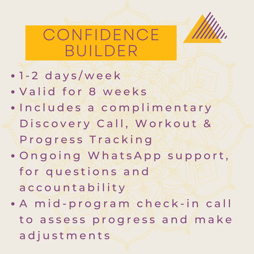 - Confidence BuilderR1200 (Zone)/from R1400 (Home) - 1 day/weekR2000 (Zone)/from R2400 (Home) - 2 days/weekA structured program with 1-2 training days per week, designed for clients looking to build confidence and consistency. Sessions are customized to align with your specific goals, whether it's weight loss, muscle building and toning, improved flexibility and mobility, enhanced fitness , or sports performance.Show more